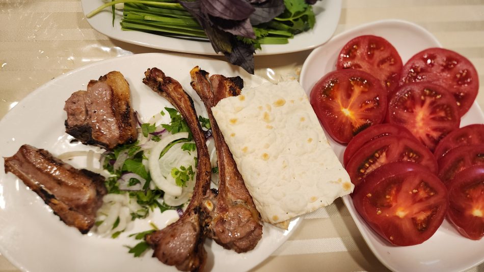 Cut off 35-40-gram pieces of lamb from the thigh or back, salt and pepper, thread the pieces onto long thin metal skewers and cook over hot coals. Sometimes we marinate meat. Kebab should be served as soon as it is ready. As soon as they are cooked, serve the lamb pieces with rings of raw onion, chopped herbs, sumakh or narsharab, and lavashβthin bread.
